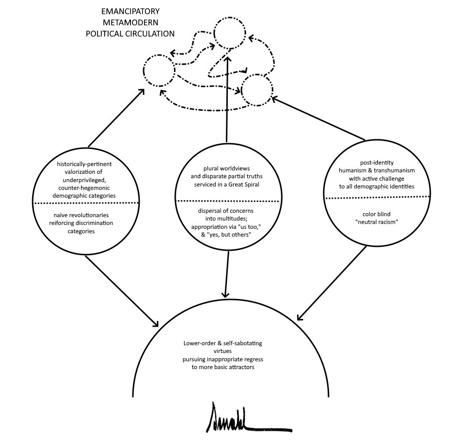 So metamodern politics is faced with a complex challenge. It must try to accept the emotional (and medical) reality of ethnicities with unique histories. It must also work to secure the basic dignity of all people, redress particular distortions that embed racist tension into putatively humane systems, transmute both cruel-oppressive & aggrieved-revolutionary feelings, secure humanism while reaching beyond into ecology and healthy transhumanism, upgrade modernity’s economic and decision-making protocols, while sanely deconstructing the basic ideas that underpin the dominant racial dialectic. Just do all of that at the same time. Justice!