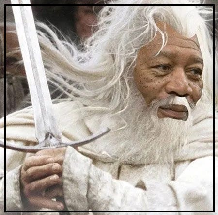 The fantasized qualities of whiteness often lend themselves to purity (virgin snow), wisdom (the white hair of elders), illumination (white light), and the celestial realm (mountain tops & clouds). Here’s a picture of Gandalf the White if he were Black: